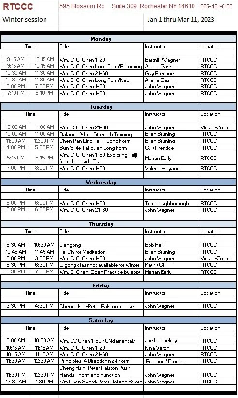Classes may be in-person, virtual/online, or in some outside location (Seasonal and weather permitting). Consult your teachers for the location of the upcoming classes